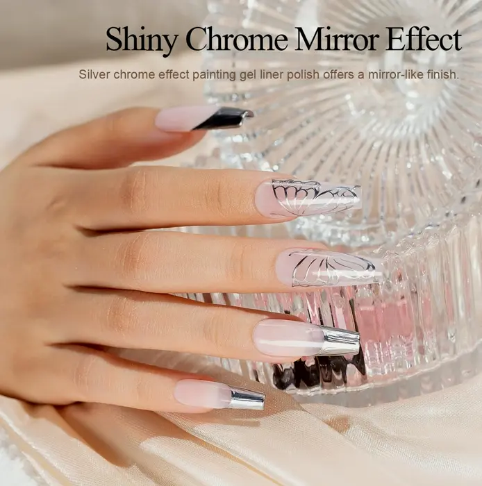 Elevate your manicure art with this metallic silver gel liner, ideal for both salon use. Featuring a built-in thin brush, it offers accuracy and convenience in creating stunning designs. Achieve a mirror-like chrome effect that reflects light for a modern look. Test it for various designs and discontinue use if any allergic reactions occur.
