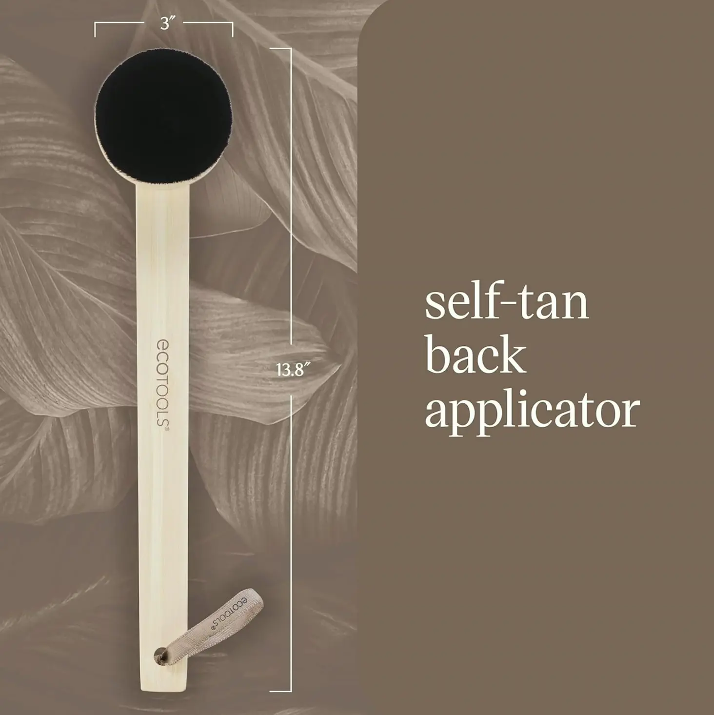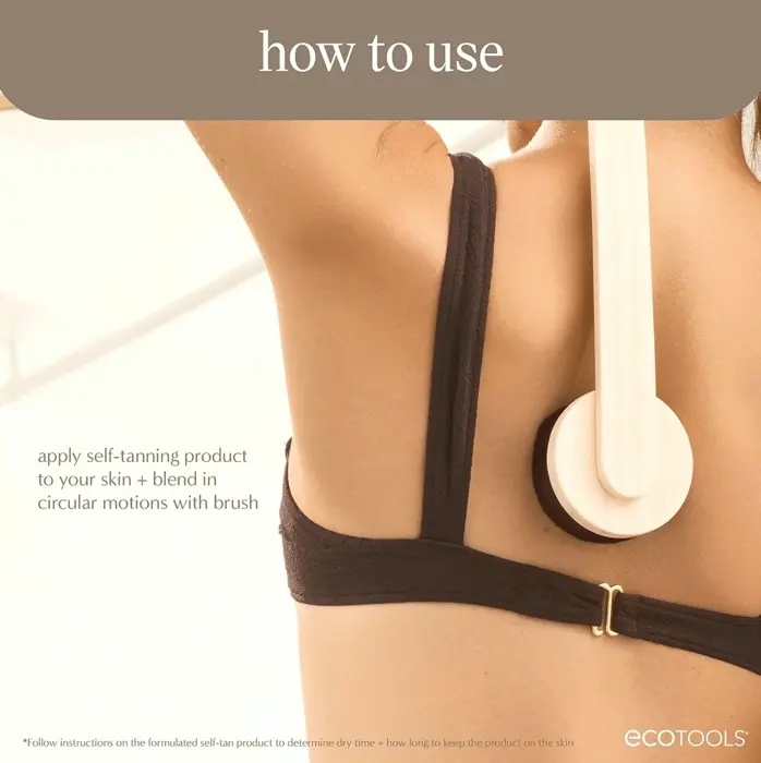 The self-tan back brush ensures smooth, mess-free tanner application. Its long, curved handle reaches difficult spots. Ideal for tanning products, and compatible with bristle brush applicator, promoting smooth blending. Made from renewable materials – EcoTools offers planet-friendly sunless solutions. Vegan and Cruelty-Free, with recyclable packaging.