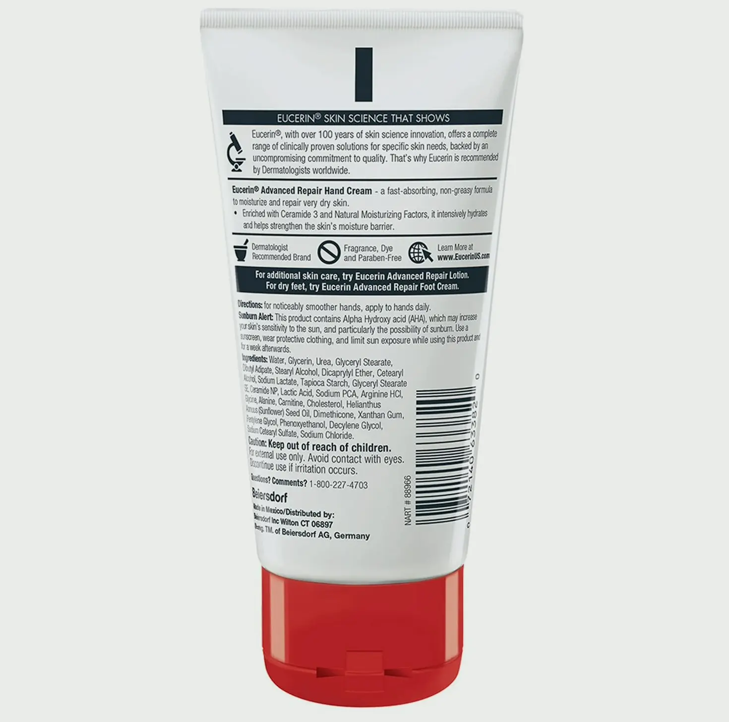 Eucerin hand cream mends rough skin texture. Its quick-absorbing formula makes your hands softer with just one application. Enriched with buffered Alpha Hydroxy, Ceramide-3, and NMFs, it offers long-term softness. Travel-friendly pack is additionally fragrance-free and dye-free, making this cream great for travel use.