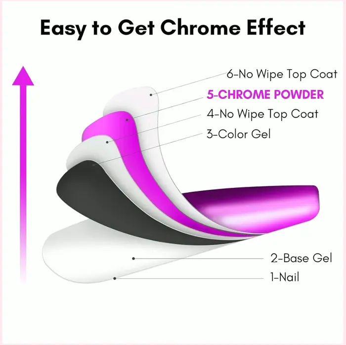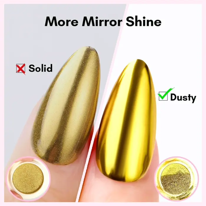Experience a stunning metallic effect with our chrome manicure powder kit. It comes in 10 metallic colors with 10 application sticks, giving your nail art a magical shiny touch. The professional-quality, non-toxic, odorless pigments provide seamless texture and superb color intensity. With one jar, you can apply a full manicure for 150-300 applications. Experiment with different base colors to achieve eye-catching designs. Suitable for UV gel, polish nail polish, dip powder, acrylic powder, and natural nails, proving it an essential tool for 3D nail art designs. Hints: Open the jar with caution to prevent powder from spilling out. Use a non-wipe top coat and UV LED light for a shiny chrome finish.