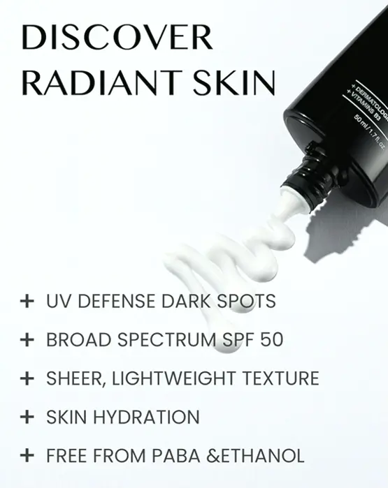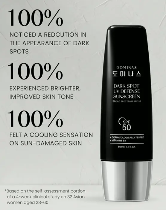 Discover effective comprehensive SPF 50 coverage against dark spots. This lightweight formula absorbs seamlessly into your skin without white residue. Infused with key ingredients and beneficial extracts, it improves skin texture. Nourish & hydrate your skin in one application with DOMINAS, a blemish care pioneer since 1985.