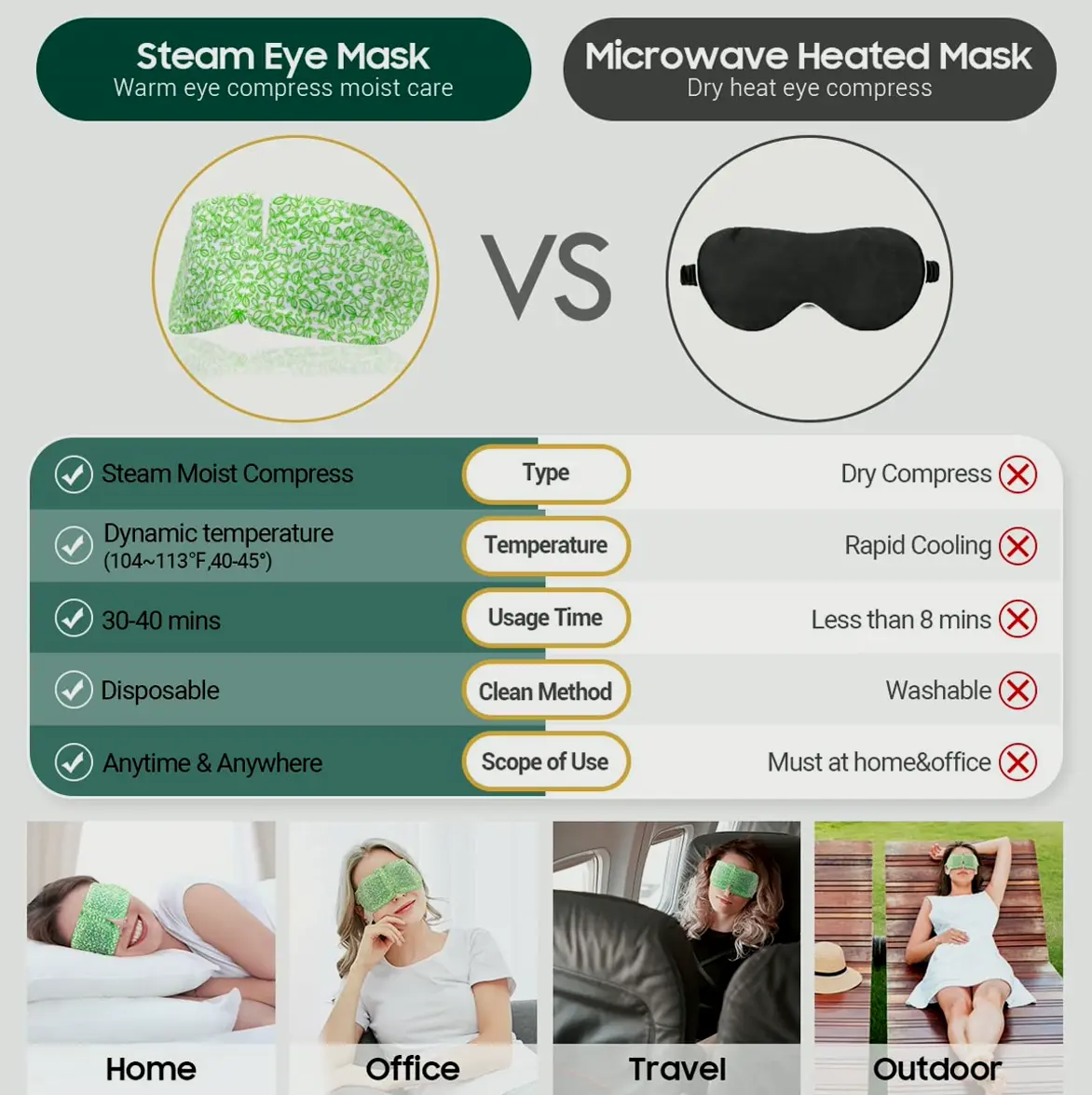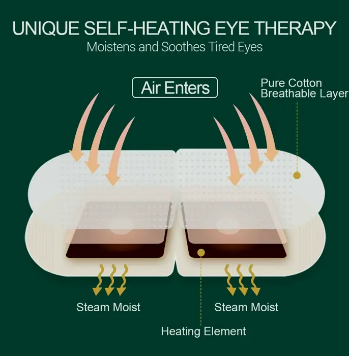 Our thermal ocular steam mask can alleviate eye strain, hydrate the eyes, enhance sleep patterns, reduce puffiness & dark circles. This self-heating ocular mask can promote blood flow, release fine humid steam, soothe the skin near eyes, assuring you enjoy an unseen eye spa steam, easing dry eyes properly. Enjoy whenever, wherever – constructed of gentle and flexible fabric preventing eyeball discomfort. The elastic ear hooks suit different face shapes, suitable for day or night, sleep or just a nap, travel, or in front of a computer after a long day. Savor comfortable warmth with our disposable mask which endures about 30-40 minutes. Our warm eye mask adopts steam heating and temperature control technology, up to 104~113°F. The heated eye mask emits fine moist steam, hydrates skin around eyes, letting tired eyes relish the steam. Steam heat eye covers are light and easy to transport. They are widely utilized in life by office workers, students, businesspeople, travelers, etc. Experience an eye SPA at any time: at bedtime, relaxation time, noontime snooze, traveling on airplane or train, rest time in the office. The eye covers are made of gentle medical non-woven fabric. Auto heating, no need for microwave or electric plug. Just open and put on the eyes. Instant action with air, creating invisible steam to relieve anxiety, enhancing your mood and helping you fall asleep smoothly. Our disposable eye mask makes a practical gift for everyone. Relax your eyes while traveling, adding it to your airplane travel essentials, work trip must-have, office stress relief, sleepover gathering for girls, selected party favors for adults, recovery relief, meditation accessories, jet lag mask, spa eye relax mask. Steam Eye Mask, always your ultimate pick!