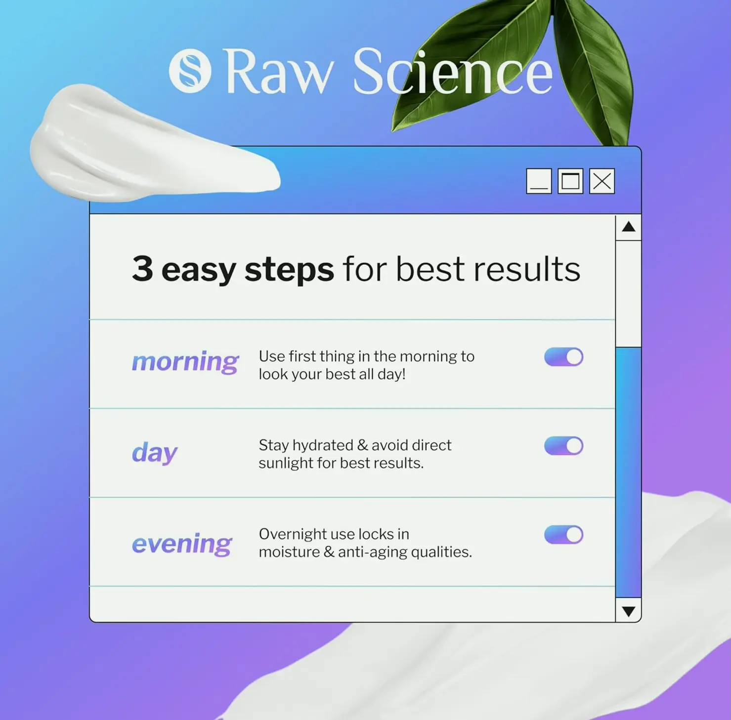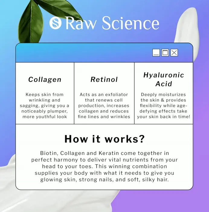 This anti-aging face cream for women as well as men intensely hydrates to minimize the appearance of aging skin, revitalizing a youth-filled glow for smooth, plump skin. The non-greasy blend absorbs quickly and suitable for every skin type. Containing collagen, Hyaluronic Acid, Vitamin E, and Retinol, this product fills in fine lines and wrinkles, leaving your skin fresher than ever. Whether seeking an anti-wrinkle formula and collagen lotion, Raw Science is your dependable brand.